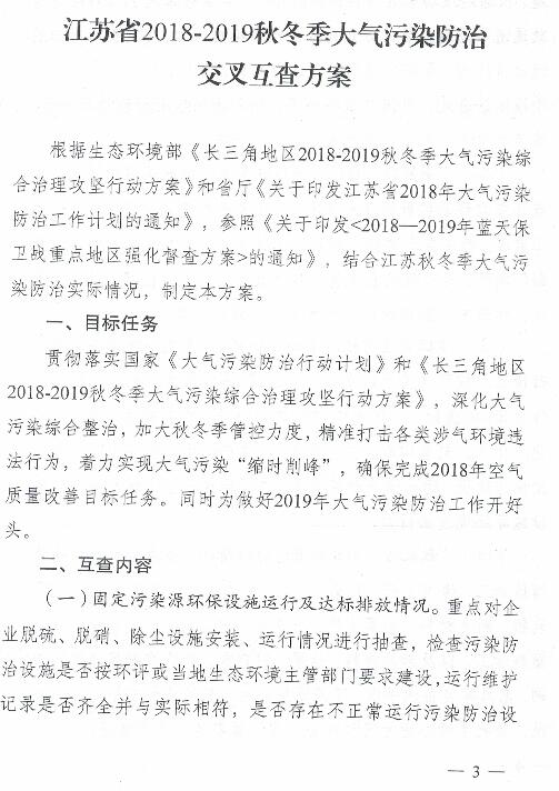 關(guān)于印發(fā)江蘇省2018-2019秋冬季大氣污染防治交叉互查方案的通知