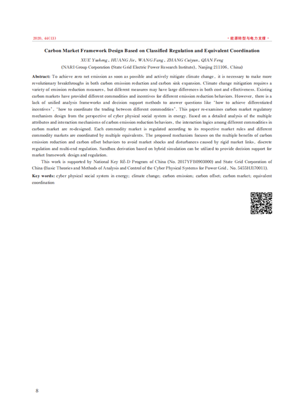 摘要:為盡快實(shí)現(xiàn)凈零排放,積極應(yīng)對(duì)氣候變化,需要全球在碳源減排及碳匯增容 2 個(gè)方面取得更具變革性的突破。應(yīng)對(duì)氣候變化需要多種減排措施,其成本及效果均有較大差異,當(dāng)前碳市場(chǎng)研究已為不同減排行為提供差異化的商品種類和激勵(lì)力度,但如何具體確定并落實(shí)差異化激勵(lì)力度以及如何協(xié)同不同商品種類間的交易流通,目前還缺乏統(tǒng)一分析框架和決策支撐方法。在能源領(lǐng)域的信息物理社會(huì)系統(tǒng)視角下討論碳市場(chǎng)的調(diào)控機(jī)制設(shè)計(jì),在詳細(xì)剖析碳減排行為的多重屬性及其交互機(jī)理的基礎(chǔ)上,重新設(shè)計(jì)了碳市場(chǎng)不同商品間的交互框架,即商品內(nèi)部遵循各自市場(chǎng)規(guī)律分類監(jiān)管,商品間通過多層當(dāng)量實(shí)現(xiàn)協(xié)調(diào),注重碳減排和碳抵消行為的多重效益,規(guī)避由于剛性鏈接、離散調(diào)控、多頭調(diào)控等問題所產(chǎn)生的市場(chǎng)沖擊及市場(chǎng)振蕩。通過基于混合仿真的沙盤推演,支撐碳市場(chǎng)架構(gòu)設(shè)計(jì)及調(diào)控決策。