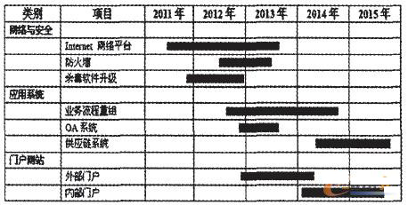 然后,將信息化建設(shè)過程分解為相互關(guān)聯(lián)、互相支撐的若干子項目,定義每一項目范圍、收益、重要性、預(yù)計成本、時間、資源等等。根據(jù)這些因素對項目進(jìn)行評分。根據(jù)分?jǐn)?shù)高低進(jìn)行排序。最終形成企業(yè)的項目實施計劃、年度投資計劃、培訓(xùn)計劃、管理計劃等活動。以下是某企業(yè)的信息化五年實施計劃(部分)。