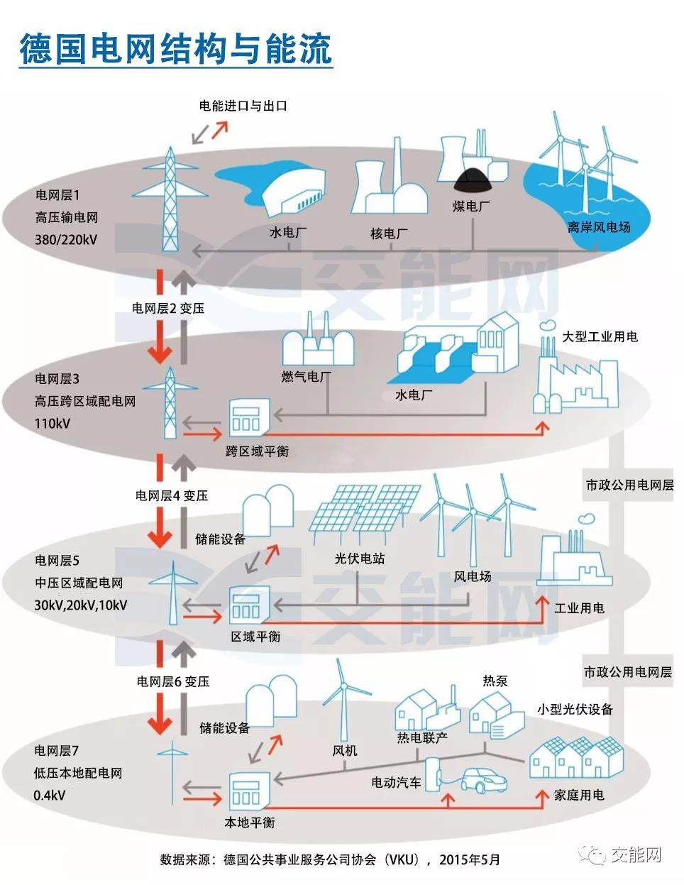 本周圖表來(lái)源于德國(guó)公共事業(yè)服務(wù)公司協(xié)會(huì)。通過(guò)一張圖表清晰闡述了德國(guó)電網(wǎng)結(jié)構(gòu)與能流。