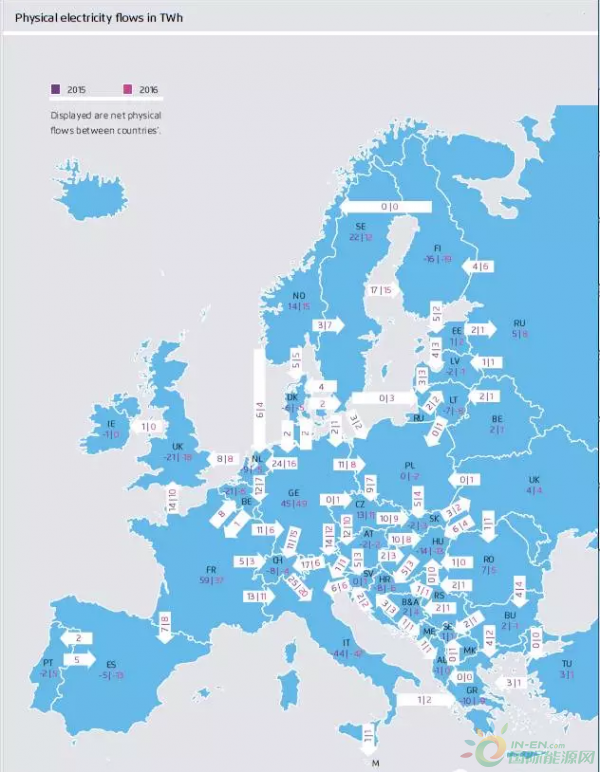 歐洲國(guó)家實(shí)現(xiàn)能源轉(zhuǎn)型的重要支柱是電力的互通互聯(lián),下圖顯示2015和2016年歐洲國(guó)家之間的電力交易額和流向。