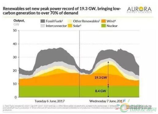 2017年6月7日下午1時,英國可再生能源發(fā)電出力達到創(chuàng)紀錄的19 3吉瓦(其中風電9 5吉瓦、太陽能7 3吉瓦),滿足50 7%的電力負荷;而同時核電出力8 4吉瓦、天然氣電廠7 2吉瓦,當時沒有煤電廠運行。值得注意的是,從6