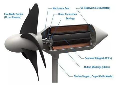 渦輪機本身設計成能承受極端海浪和惡劣天氣(比如臺風),就像一朵花,直徑為70公分的5條旋轉(zhuǎn)葉片由柔軟材料制成,旋轉(zhuǎn)速度慢到足夠讓不小心被葉片掃過的海洋生物逃脫不受傷,支架結(jié)構(gòu)也靈活彎曲,以避免它們在大浪之下“剛極必折”。研究團隊估計,渦輪機的使用壽命長達10年。