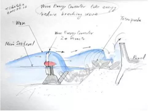 而日本的波浪能量轉(zhuǎn)換系統(tǒng)(Wave Energy Converter,WEC)則和防波堤用四腳錐體塊并肩作戰(zhàn),這些渦輪機放置在第一火線上,比如四腳錐體塊的前方或是珊瑚礁地形。由于從深海涌上淺海珊瑚礁的波浪會因“斷裂”產(chǎn)生極快速水流,渦輪機便在收集海浪能量的同時抵消浪潮直接沖擊岸邊的力道,減少日本沿岸受到的影響。