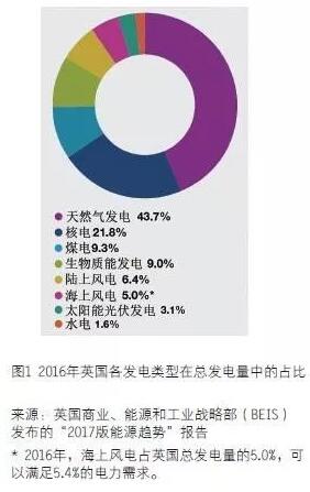 2016 年,英國海上風電所發(fā)電量占該國全社會總用電量的5.4%,可以滿足15%的家庭的用電需求。雖然這一年,英國海上風電的建設規(guī)模有所縮小,但在2017 年,7 個新項目有望實現首次并網發(fā)電,這是自2010 年以來規(guī)模最大的一年。