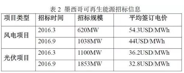2015年11月,墨西哥宣布開展第一次大規(guī)??稍偕茉错椖空袠恕=趤砜?,已完成的兩輪招標分別是2016年3月和9月的項目招標,情況如下表: