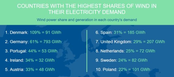 從歐盟成員國(guó)來(lái)看,丹麥的風(fēng)力發(fā)電量產(chǎn)生剩余,是其國(guó)內(nèi)需求的1.09倍,德國(guó)風(fēng)力發(fā)電量占其國(guó)內(nèi)需求的61%。