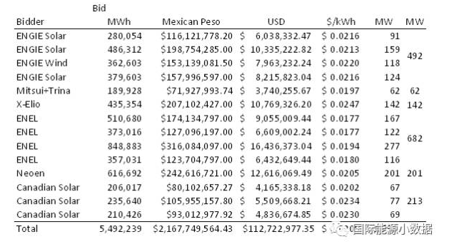墨西哥能源部2.3吉瓦/5.5TWh(55億度,2020年入網(wǎng))光伏采購(gòu)競(jìng)標(biāo)結(jié)果日前出爐,意大利ENEL綠色電力公司報(bào)價(jià)1.77美分/千瓦時(shí)(相當(dāng)于人民幣0.11元/千瓦時(shí)),刷新不久前沙特阿拉伯1.79美分/千瓦時(shí)的光伏報(bào)價(jià)最低紀(jì)錄。在這次墨西哥的光伏項(xiàng)目競(jìng)標(biāo)中,其他公司(也包括中國(guó)公司)的平均報(bào)價(jià)為2.05美分/千瓦時(shí)。