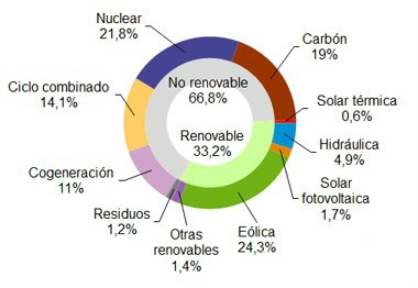 其中,2017年12月份,西班牙可再生能源發(fā)電量占比達(dá)到33.2%,其中光熱發(fā)電占0.6%。核電、聯(lián)合循環(huán)、熱電聯(lián)產(chǎn)、煤電、水電、風(fēng)電、光伏發(fā)電、其他可再生能源發(fā)電占比情況分別為21.8%、14.1%、11%、19%、4.9%、24.3%、1.7%與1.4%。