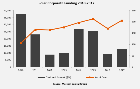 全球清潔能源通訊和咨詢公司Mercom資本日前發(fā)布2017年太陽能行業(yè)融資和并購活動(dòng)的年度報(bào)告稱,全球企業(yè)對太陽能行業(yè)的融資總額達(dá)到128億美