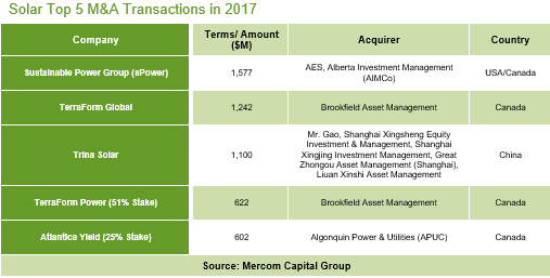 2017年最大和最顯著的交易是AES和艾伯塔投資管理(AIMCo)從FirTreePartners以16億美元收購FTPPower(sPower)。