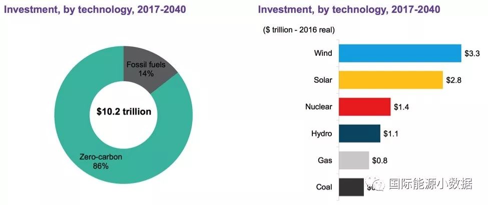 巨額的資金正在流向可再生能源的開發(fā)。根據(jù)彭博新能源財(cái)經(jīng)的數(shù)據(jù),2017-2040年全球新增電力裝機(jī)投資將達(dá)10.2萬億美元,其中86%用于可再生能源發(fā)電裝機(jī)。