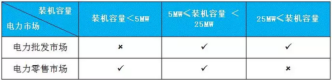 根據(jù)《電力法》規(guī)定,發(fā)電人能參與電力批發(fā)市場還是電力零售市場,主要取決于其裝機容量。除因技術(shù)條件不具備等極個別特殊情形外,電站的裝機容量與其可以參與的電力市場存在如下表所示的對應關(guān)系: