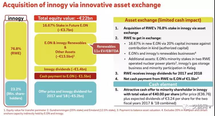 此次資源置換總資本約有220億歐元,原innogy公司由RWE掌握76.8%的股份。作為交換條件,E.ON提供16.67%的未來(lái)的股權(quán)(37億歐元);其旗下的innogy可再生能源業(yè)務(wù)與部分核電,天然氣儲(chǔ)能等資產(chǎn)(約135億歐元);Innogy分紅(14億歐元);同時(shí),RWE支付給E.ON約15億歐元的股票現(xiàn)金。