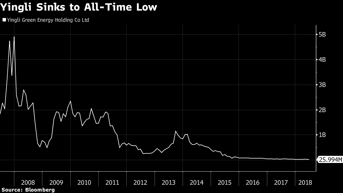 英利多年來一直在解體。該公司自2010年以來一直沒有發(fā)布年度利潤,是中國制造商浪潮中的一部分,這些制造商用低成本設備淹沒市場,積極借貸擴張工廠。英利綠色能源的市場價值在2007年達到了近50億美元的峰值,但由于太陽能電池板的價格下跌擠壓了收入,因此債務累積。2014年,這家一度是全球頂級制造商的英利綠色能源開始走下神壇。
