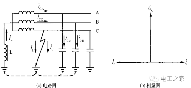 上述電路中如果發(fā)生單相接地故障時(shí)接地電流比較大,會(huì)出現(xiàn)斷續(xù)電弧,由于電力線路中含有電阻、電感、電容,因此在單相弧光接地時(shí),可能會(huì)形成串聯(lián)諧振,出現(xiàn)過(guò)電壓(正常時(shí)的2.5-3倍),導(dǎo)致線路上絕緣薄弱地點(diǎn)出現(xiàn)絕緣擊穿;在此單相接地電容電流大于一定值的系統(tǒng)中,電源中性點(diǎn)經(jīng)消弧線圈接地。