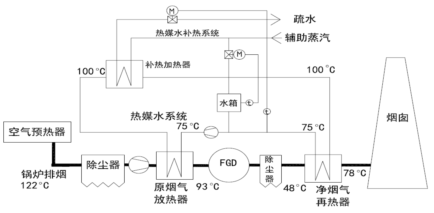 (1)提高煙囪凈煙氣的排放溫度,使其由40-50℃提高到~78℃,消除石膏雨及煙囪冒白煙現(xiàn)象。