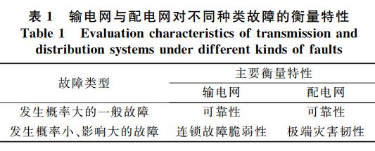 引入配電網(wǎng)韌性,是為了從總體上評估配電網(wǎng)受極端自然災(zāi)害這類低概率事件的影響程度及其應(yīng)對能力。其對配電網(wǎng)的意義,類似于連鎖故障脆弱性對輸電網(wǎng)的價值,如表1所示。可見,對于發(fā)生概率較大的常見故障(例如線路短路、單一設(shè)備損壞),配電網(wǎng)和輸電網(wǎng)都是用可靠性來衡量:配電網(wǎng)常用的可靠性指標(biāo)包括SAIDI,SAIFI以及供電可靠性是多少個“9”;輸電網(wǎng)雖然沒有計(jì)算具體指標(biāo),但是采用了N-1校驗(yàn)標(biāo)準(zhǔn),用保守的運(yùn)行邊界限制確保輸電網(wǎng)具有足夠高的可靠性。