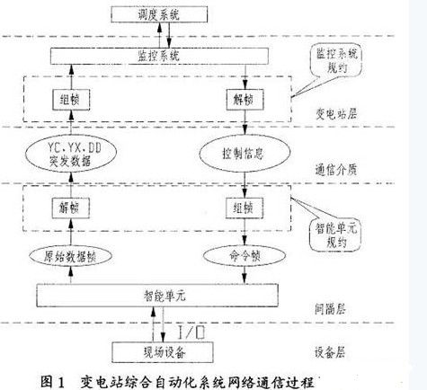 變電站綜合自動化系統(tǒng)的通信功能,由系統(tǒng)與調(diào)度中心的通信及系統(tǒng)內(nèi)部設(shè)備間的通信兩部分組成。變電站綜合自動化系統(tǒng)網(wǎng)絡(luò)通信過程原理見圖1。