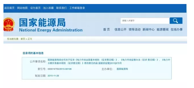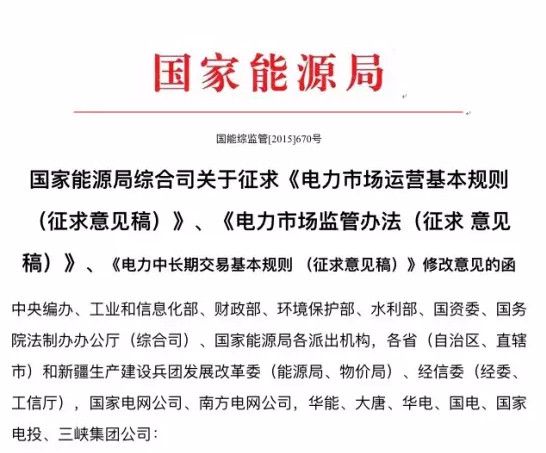 摘要:國家能源局就緊接著在官方網(wǎng)站上公布了《電力市場監(jiān)管辦法》、《電力市場運(yùn)營基本規(guī)則》、《電力中長期交易基本規(guī)則》等三個文件的征求意見稿,公開征求社會各界的意見。