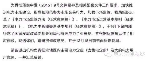 摘要:國家能源局就緊接著在官方網(wǎng)站上公布了《電力市場監(jiān)管辦法》、《電力市場運(yùn)營基本規(guī)則》、《電力中長期交易基本規(guī)則》等三個文件的征求意見稿,公開征求社會各界的意見。來源:微信公眾號電力法律觀察