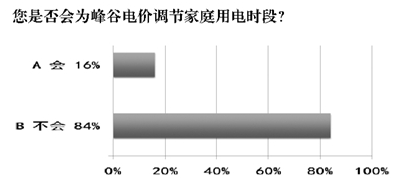《問卷》結(jié)果顯示,面對目前國家實(shí)行的峰谷電價(jià),有84%的居民表示不會(huì)為峰谷電價(jià)調(diào)節(jié)家庭用電時(shí)段,僅有16%的居民會(huì)做出調(diào)整(見圖表)。