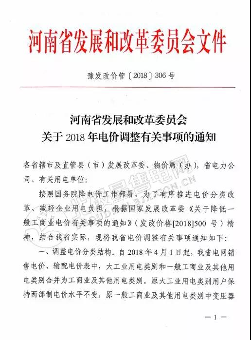 河南省發(fā)改委日前發(fā)布了關(guān)于2018年電價(jià)調(diào)整有關(guān)事項(xiàng)的通知,通知提出,自2018年4月1日起,河南省工商業(yè)及其他用電類(lèi)別中單一制電價(jià)水平,由