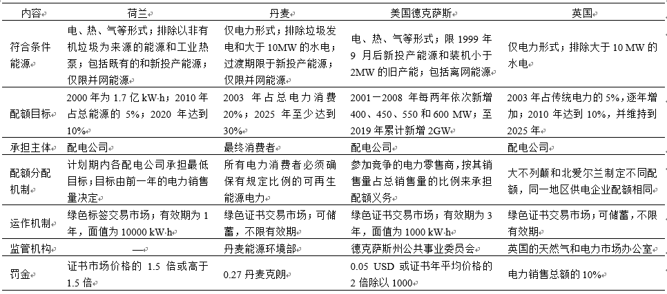 其中,關(guān)于有效的可再生能源發(fā)電組合,丹麥和英國僅限于電力形式,而荷蘭和德克薩斯州包含了電、熱、氣等形式;此外,荷蘭和丹麥符合條件的可再生能源又被限定為并網(wǎng)能源,美國包括了離網(wǎng)能源,英國未限定。關(guān)于配額設(shè)定,德克薩斯州以新增裝機容量為目標,其余以可再生能源電量或其比例為參量。針對配額承擔主體選定,丹麥是最終消費者,其余為配電公司。此外,各國或地區(qū)因?qū)嶋H情況差異,配額分配機制各不相同,且配額制施行中均引入了綠色證書制度,除荷蘭外,其他國