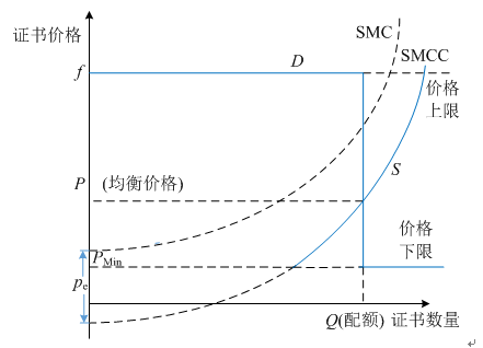 由綠電廠商產(chǎn)量決定;且SMCC等于綠電短期邊際成本(short-term marginal cost,SMC)減去終端電價(Pe)。綠色證書需求與供給決定了其均衡價格PTGC,且PMin≤ PTGC≤ PMax。