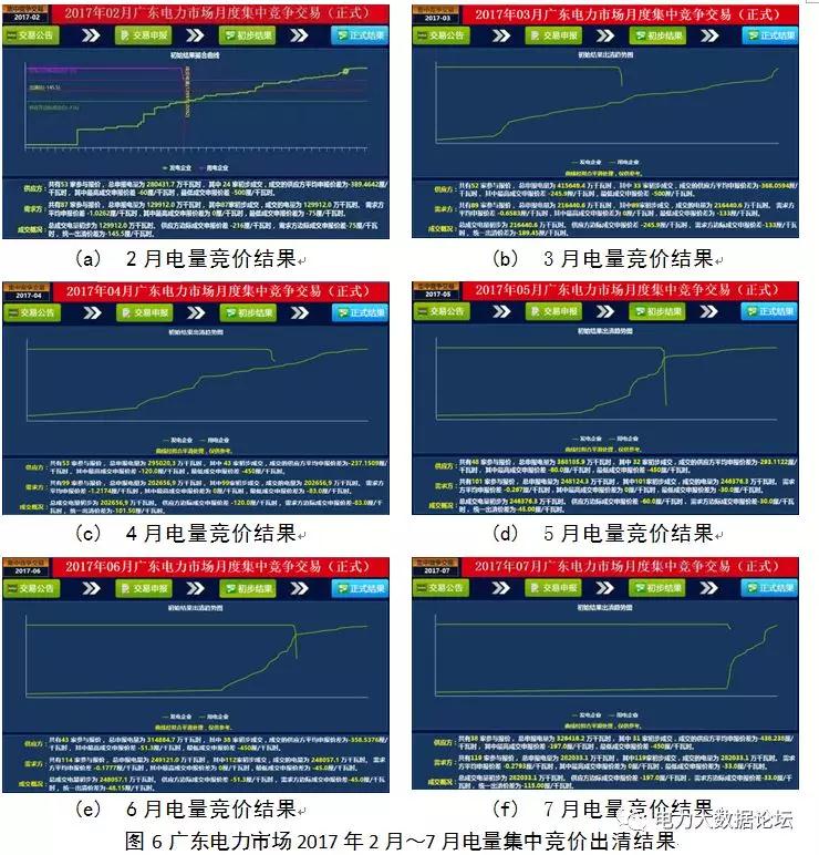 任何市場(chǎng)設(shè)計(jì)方案最終都要經(jīng)受實(shí)踐的檢驗(yàn)。實(shí)地研究(fieldresearch,也稱為“田野調(diào)查”)是深入到研究對(duì)象實(shí)地,以觀察、訪談的方法搜集實(shí)際數(shù)據(jù),并通過(guò)對(duì)實(shí)際情況的分析研究來(lái)解釋社會(huì)現(xiàn)象的一種研究方式,是市場(chǎng)研究的最后一個(gè)環(huán)節(jié)。圖6為作者搜集的廣東電力市場(chǎng)2017年2月~7月電量集中競(jìng)價(jià)出清結(jié)果(采用統(tǒng)一邊際價(jià)格出清方式),圖中的曲線為參與交易的供應(yīng)方和需求方的總體報(bào)價(jià)曲線。可以看出,需求方和供應(yīng)方的報(bào)價(jià)策略均有一定的規(guī)律性。從需求方(大用戶和售電公司)策略來(lái)看,絕大部分電量(97%以上)都采取了0報(bào)價(jià)(天花板報(bào)價(jià)),只有少部分電量報(bào)價(jià)下探以博弈邊際價(jià)格,形成俗稱的“釣魚(yú)曲線”,但在統(tǒng)一邊際價(jià)格出清方式下,這少部分電量報(bào)價(jià)卻影響整個(gè)市場(chǎng)價(jià)格。從供應(yīng)方(發(fā)電廠)策略來(lái)看,從2月到7月電量競(jìng)價(jià),越來(lái)越多的供應(yīng)方報(bào)地板價(jià),形成俗稱的“跳高曲線”。按目前的廣東電力市場(chǎng)交易規(guī)則,在月度電量競(jìng)價(jià)中,需求方報(bào)價(jià)越高越優(yōu)先成交,最高限價(jià)為0厘/千瓦時(shí)(價(jià)差),供應(yīng)方報(bào)價(jià)越低越優(yōu)先成交,最低限價(jià)為-450厘/千瓦時(shí)(價(jià)差)。無(wú)論是供應(yīng)方還是需求方,保電量(保成交)都是第一考慮,而在統(tǒng)一邊際價(jià)格出清方式下,除邊際的供需方外,大部分供應(yīng)方和需求方的報(bào)價(jià)與市場(chǎng)出清價(jià)沒(méi)有任何關(guān)系,報(bào)地板價(jià)或天花板價(jià)搭便車就成為普遍現(xiàn)象。需要特別說(shuō)明的是,這些出清順序及市場(chǎng)主體的策略性行為在經(jīng)典供需均衡理論中是完全沒(méi)有考慮的?;蛘哒f(shuō)圖5、圖‍6中的實(shí)際報(bào)價(jià)曲線與微觀經(jīng)濟(jì)學(xué)中的理論供需曲線[1]“形似而神不似”,其實(shí)質(zhì)是完全不同的,經(jīng)典經(jīng)濟(jì)學(xué)理論不能生搬硬套,這也說(shuō)明實(shí)地研究的重要意義。