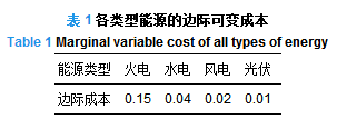對各類能源參與直接交易來說,考慮固定成本意義不大,用邊際成本更能體現(xiàn)發(fā)電企業(yè)參與交易的競爭力[7-9]。根據(jù)SolarZoom網(wǎng)上數(shù)據(jù),在當(dāng)前國家補貼力度下,新能源發(fā)電的邊際成本接近0,比火電有明顯的優(yōu)勢,具體如表1所示。