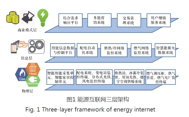 能源互聯(lián)網(wǎng)在縱向可以劃分為三層,從低層至頂層依次為物理層、信息層和商業(yè)模式層,如圖1所示。能源互聯(lián)網(wǎng)通過信息能量深度耦合以及多能源系統(tǒng)的廣泛集成,能夠?qū)崿F(xiàn)電能、冷、熱能的高效生產(chǎn)、靈活控制以及智能利用,促進可再生能源的大幅接入,實現(xiàn)開放、靈活互動的電能交易形式,能夠深入挖掘用戶需求響應(yīng)潛力,最終整體提高終端能源的使用效率,降低能源生產(chǎn)成本,減少全社會碳排放量[5]。從能源互聯(lián)網(wǎng)運營商的角度而言,通過靈活控制區(qū)內(nèi)能量生產(chǎn)環(huán)節(jié)、降低傳輸環(huán)節(jié)能耗、增強能源供應(yīng)可靠性,利用價格信號充分協(xié)調(diào)不同時間、空間以及能源形式的使用,大幅度提高終端能源生產(chǎn)與利用效率,從而創(chuàng)造額外的商業(yè)價值;對用戶而言,能夠通過合理安排能源利用,降低能源使用費用,進而降低生產(chǎn)成本;從能源互聯(lián)網(wǎng)投資商的角度,通過投資能源互聯(lián)網(wǎng)中新能源發(fā)電、冷熱電聯(lián)供、先進信息以及控制技術(shù),降低了多能源系統(tǒng)的運營成本,實現(xiàn)了充分的收資回報。