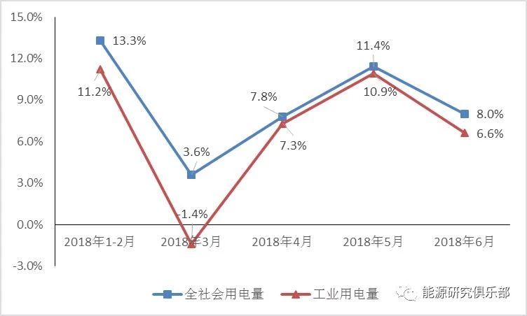 1~2月和5月用電量同比增速創(chuàng)下8年新高。分月看,1~2月用電量增速最快,主要是由于年初“冷冬”導(dǎo)致取暖負(fù)荷增加較大,且電能替代效果顯著、各地“煤改電”工程進(jìn)展速度較快增加了冬季的電力消費(fèi);3月用電量增速大幅下降,主要是由于今年春節(jié)較晚、企業(yè)庫(kù)存偏高,且受到環(huán)保督查的影響不少企業(yè)處于停工狀態(tài),工業(yè)生產(chǎn)較慢,3月規(guī)模以上工業(yè)增加值同比增長(zhǎng)6.0%,為去年9月以來(lái)最低,導(dǎo)致工業(yè)用電量同比下降;4月和5月,經(jīng)過(guò)環(huán)保督查和冬季停工,工業(yè)生產(chǎn)普遍恢復(fù),加上持續(xù)高溫天氣的影響,5月全社會(huì)用電量同比增長(zhǎng)11.4%,創(chuàng)下近8年來(lái)同期新高;進(jìn)入6月后南方區(qū)域降雨增多,用電量增速環(huán)比小幅回落3.4個(gè)百分點(diǎn)。