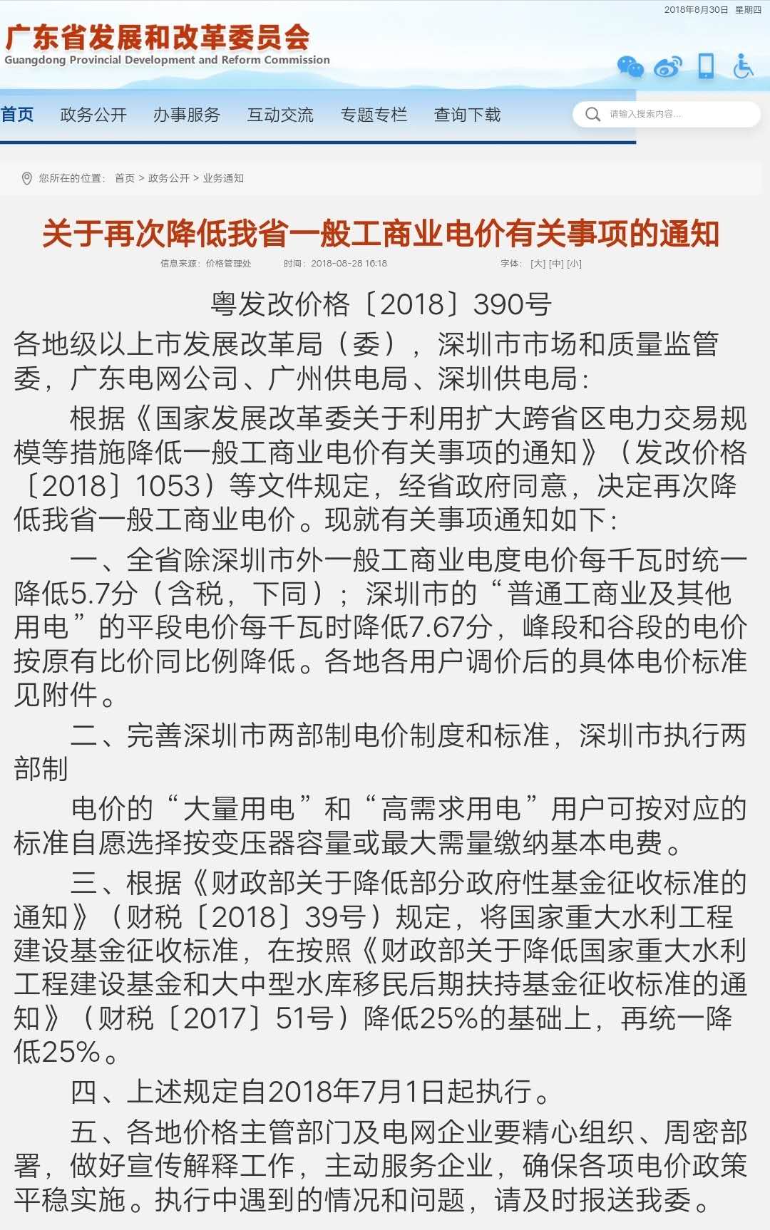 4月25日,廣東省發(fā)改委發(fā)文《廣東省發(fā)展改革委關(guān)于降低我省一般工商業(yè)電價(jià)有關(guān)事項(xiàng)的通知》(粵發(fā)改價(jià)格〔2018〕213號),全省(除深圳市外)一般工商業(yè)電度電價(jià)每千瓦時(shí)統(tǒng)一降低1.78分(含稅,下同),深圳市各類工商業(yè)及其他電價(jià)均統(tǒng)一降低0.59分。