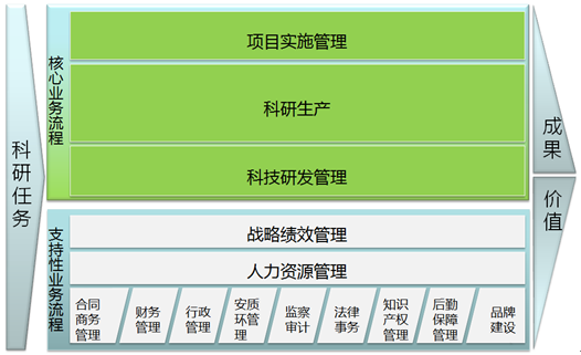 方案編制過程中依據(jù)研究院的業(yè)務(wù)現(xiàn)狀,對研究院的業(yè)務(wù)流程進行了梳理,明確了支持研究院戰(zhàn)略目標(biāo)實現(xiàn)的一、二級業(yè)務(wù)流程框架體系。如圖2所示。