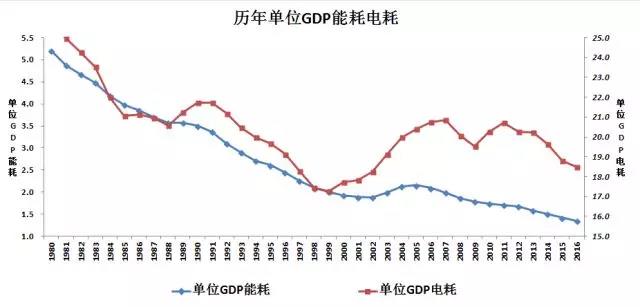 能源消費總量增速趨緩是能源轉(zhuǎn)型的契機。我國經(jīng)濟發(fā)展階段正在向后工業(yè)化階段轉(zhuǎn)型,技術(shù)創(chuàng)新與進步使各個行業(yè)的能源利用效率水平大幅度提高,具有資金密集型和能源高強度投入屬性的基礎(chǔ)材料業(yè)生產(chǎn)比重有所降低,全社會經(jīng)濟發(fā)展的質(zhì)量和能效在加快提高,經(jīng)濟發(fā)展對能源投入需求的依賴在減弱。改革開放以來四十年來,燃煤電廠的能源轉(zhuǎn)換和電力輸送效率均提高了30%以上;全球金融危機后2010年以來的7年間,鋼鐵冶煉能效年均提高一個百分點,水泥提高大致1.5個百分點,公路運輸以及新建建筑能效更是以年均1.8個百分點的幅度大踏步提高。全國歷年平均單位GDP能耗、電耗變化趨勢見圖1。