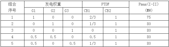 首先用上篇文章中的簡單兩區(qū)域系統(tǒng)進行分析??紤]兩個關(guān)鍵支路CB1(正常運行狀態(tài)下的線路AC)和CB2(正常運行狀態(tài)下的線路CD)。上篇文章中,在“四、報價區(qū)轉(zhuǎn)移分布因子” 中,實際上我們已經(jīng)計算了不同發(fā)電組合下兩個區(qū)域之間的最大傳輸功率Pmax(I-II)。如下表1所示(上篇文章中的表2)。