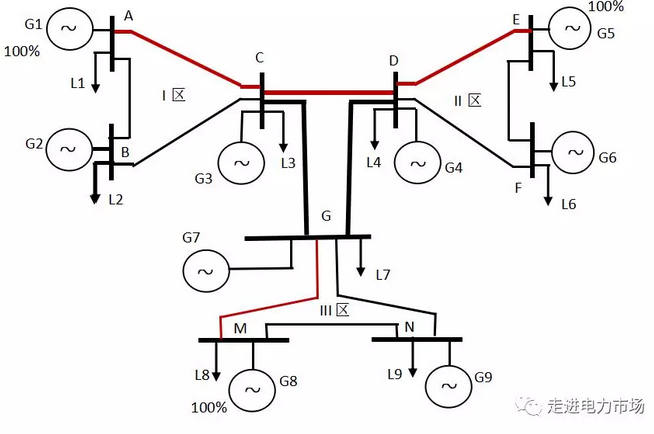 以II區(qū)為平衡區(qū),即區(qū)域I和區(qū)域III的凈功率變化都由區(qū)II平衡,相當于區(qū)域I和區(qū)域III的交易對手都是區(qū)域II。設區(qū)域III發(fā)電G7、G8、G9的發(fā)電轉(zhuǎn)移因子為 ( 0:1:0),也就說,III區(qū)的凈功率PIII(也即區(qū)域III與區(qū)域II的交易P(III-II))的變化全部由G8提供,則III區(qū)凈功率變化對CB1、CB2、CB3、CB4的轉(zhuǎn)移分布因子分別為:(0、1/3、1、2/3),可以表示為向量Fiii = [ 0 1/3 1 2/3]。