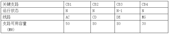 假設區(qū)域III有一個關(guān)鍵路徑CB4:正常運行下的線路MG。剩余最大可用容量為30MW。CB3的最大可用容量為80MW。表2給出了四個關(guān)鍵支路的定義。