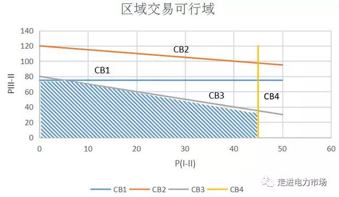 從圖3可以看到區(qū)域交易可行域空間的形成過程。首先,將每個關(guān)鍵支路代表的線路畫出,如圖中的直線CB1、CB2、CB3和CB4。其次,將不起作用的約束去除。圖中的CB2即為不起作用約束。最后,起作用約束圍起來的部分即為可行域空間,即圖中的陰影部分。
