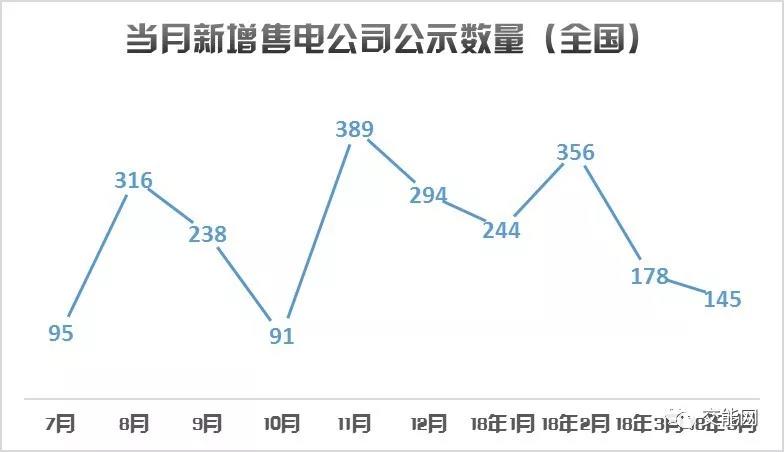 4月,北京、河北、山西、寧夏、廣東、廣西、重慶、貴州、云南、甘肅、山東、河南、青海、新疆和陜西等15省市自治區(qū)共新增公示了145家售電公司。下圖展示了近10個月來全國售電公司新增公示數(shù)量的逐月變化趨勢。