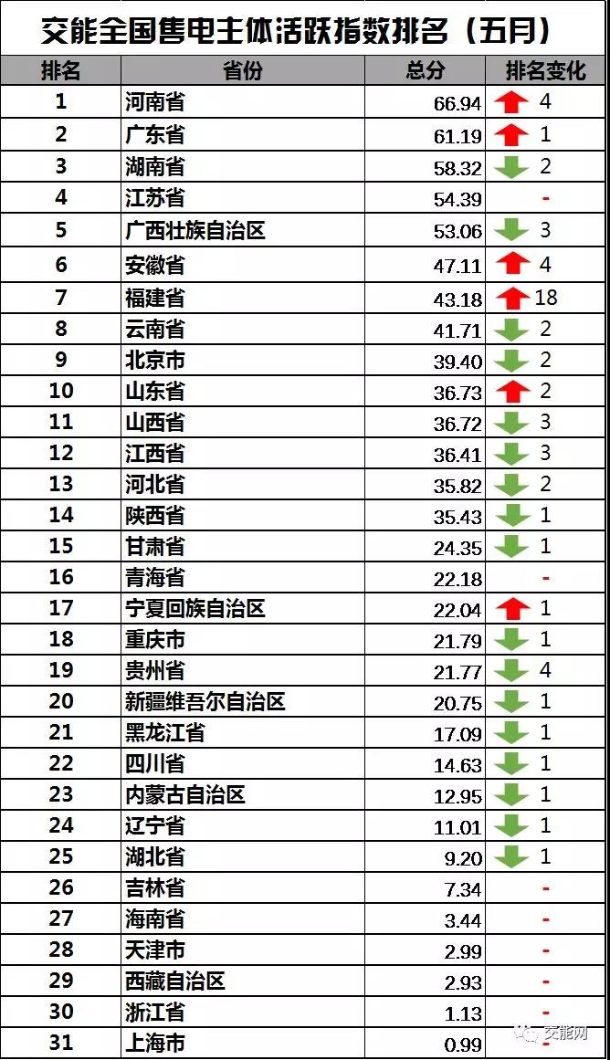 鑒于大多數(shù)指標(biāo)采取相對評分體系,福建、廣東、河南和安徽等省份在多項指標(biāo)上的出色表現(xiàn),使得全國大多數(shù)地區(qū)的絕對得分和相對排名都有一定程度的降低。得分排名前五的幾個省份為河南省(66.94分)、廣東省(61.19分)、湖南省(58.32分)、江蘇省(54.39分)、和廣西壯族自治區(qū)(53.06分)。各省詳細(xì)得分與排名變動如下圖: