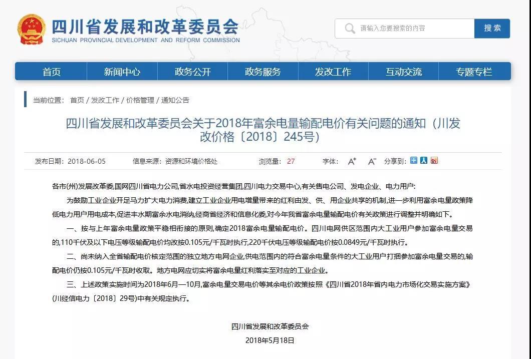 5月18日,四川省發(fā)改委發(fā)布《關于2018年富余電量輸配電價有關問題的通知》。文件明確規(guī)定, 2018年6月-10月四川電網(wǎng)范圍內(nèi),110千伏及以下電壓等級的大工業(yè)用戶,按0.105元/千瓦時的輸配電價參與富余電量交易;220千伏電壓等級的大工業(yè)用戶,按0.0849元/千瓦時的輸配電價參與富余電量交易。
