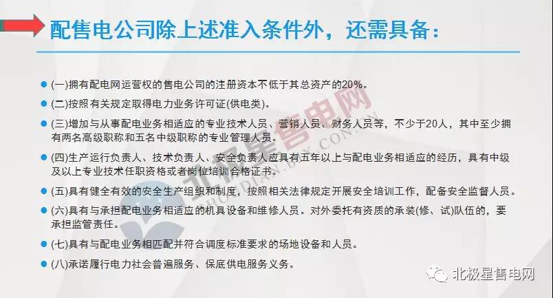 另外,擁有配電網(wǎng)經(jīng)營(yíng)權(quán)的售電公司,準(zhǔn)入條件也是有著特別的規(guī)定,除滿足上述條件外,其注冊(cè)資本不低于其總資產(chǎn)的20%,并且要取得供電類電力業(yè)務(wù)許可證。不少于20名從事配電業(yè)務(wù)相適應(yīng)的專業(yè)技術(shù)人員、營(yíng)銷人員、財(cái)務(wù)人員,其中至少擁有兩名高級(jí)職稱和五名中級(jí)職稱的專業(yè)管理人員。生產(chǎn)運(yùn)行負(fù)責(zé)人、技術(shù)負(fù)責(zé)人、安全負(fù)責(zé)人應(yīng)具有五年以上與配電業(yè)務(wù)相適應(yīng)的經(jīng)歷,具有中級(jí)及以上專業(yè)技術(shù)任職資格或者崗位培訓(xùn)合格證書(shū)。