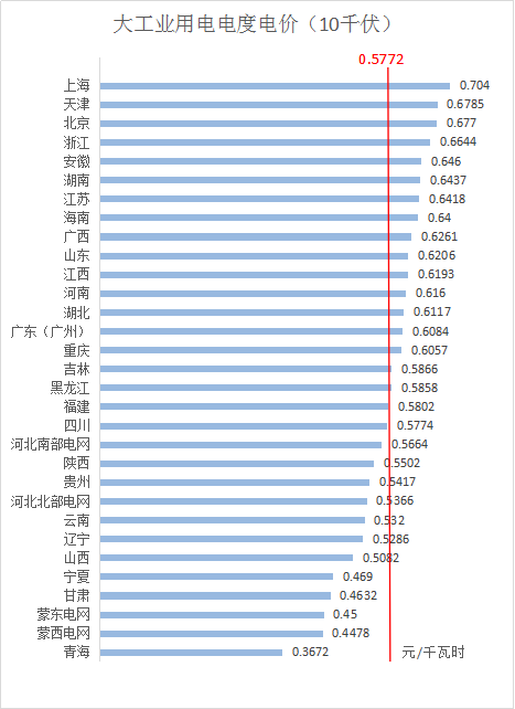 1、10千伏電壓等級下,全國平均電價約為0.5772元/千瓦時,其中,上海最高為0.704元/千瓦時,青海最低為0.3672元/千瓦時。