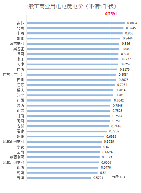 1、不滿1千伏電壓等級下,全國平均電價約為0.7591 元/千瓦時,其中,吉林最高為0.8864元/千瓦時,青海最低為0.5791元/千瓦時。
