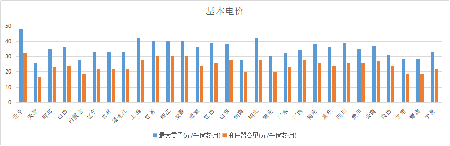 基本電價只有大工業(yè)用戶收取,分按最大需量和按變壓器容量收取。從基本電價的情況來看,按最大需量平均為35.1元/千瓦˙月,按變壓器容量平均約為24.4元/千瓦˙月,北京最高,天津最低。