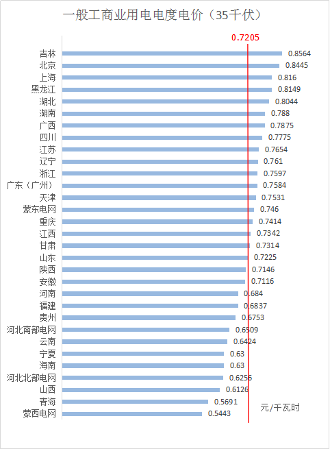 3、35千伏電壓等級下,全國平均電價約為0.7205元/千瓦時,其中,吉林最高為0.8564元/千瓦時,蒙西電網(wǎng)最低為0.5443元/千瓦時。