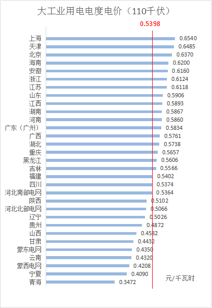 3、110千伏電壓等級下,全國平均電價約為0.5398元/千瓦時,其中,上海最高為0.654元/千瓦時,青海最低為0.3472元/千瓦時。
