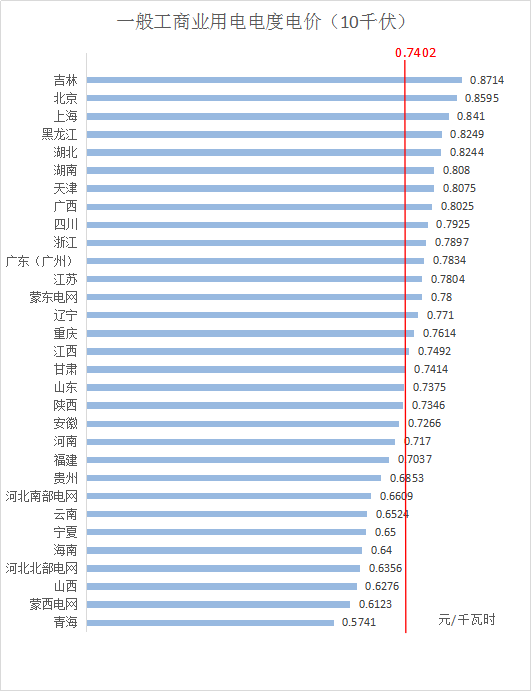 2、10千伏電壓等級下,全國平均電價約為0.7402元/千瓦時,其中,吉林最高為0.8714元/千瓦時,青海最低為0.5741元/千瓦時。